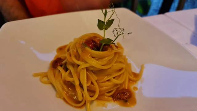 - Spaghetti aglio nero, olio, peperoncino e tartare di gambero rosso