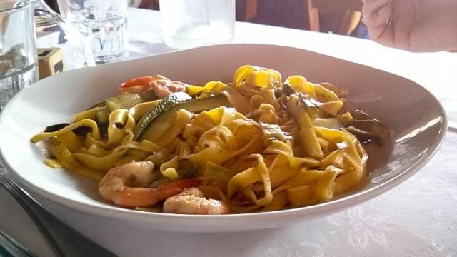9.5/10We set outside in the terrace and it was quite charming. We had fresh salad and mixed seafood salad for the first course and then a fresh "rombo" fish baked with crispy potatoes. For dessert we had the chantilly cream with berries and fluffy pieces of baked "Mille foglie". So simple but just great
