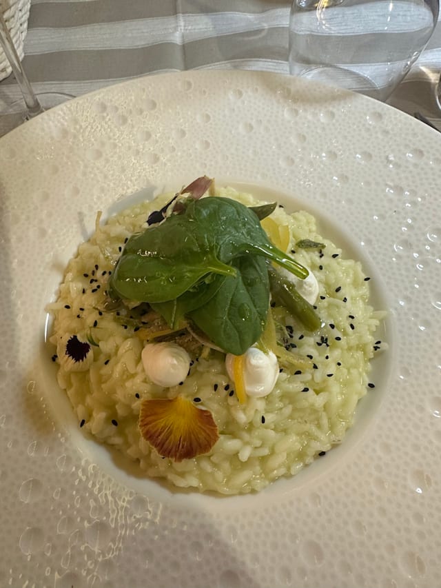 Riso carnaroli,polpo cbt, crema di patate, polpo croccante, cubotti di patata e salsa al basilico