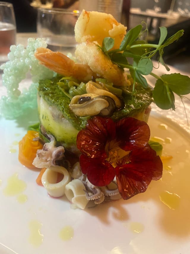 Polpo marinato cbt, pepe di cayenna,curcuma e curry piccante di madras, chilli fresco , sfera di patata e aromi , mayo al nero di seppia e gel spicy