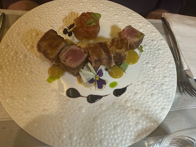 Filetto di tonno avvolto in lardo aromatizzato, chutney al pomodoro nero e prugne, senape dolce, teriyaki e olio al cipollotto