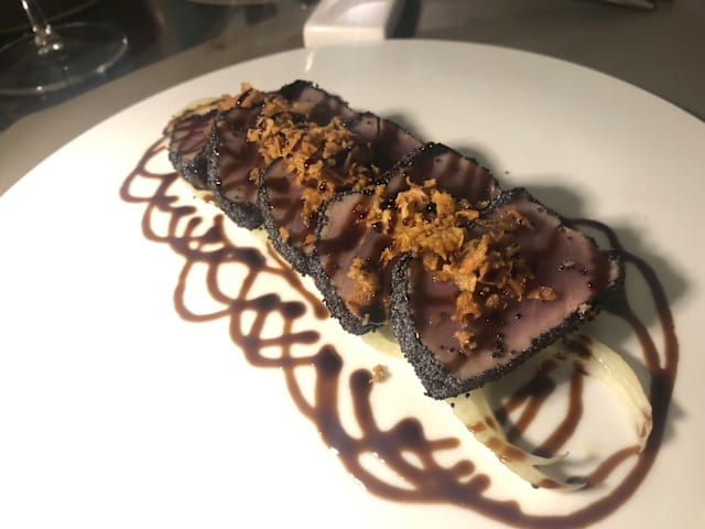 pralinato ai semi di papavero, julienne di finocchio croccante all’aceto di riso, crunchy di cipolla e riduzione di balsamico