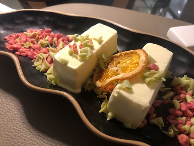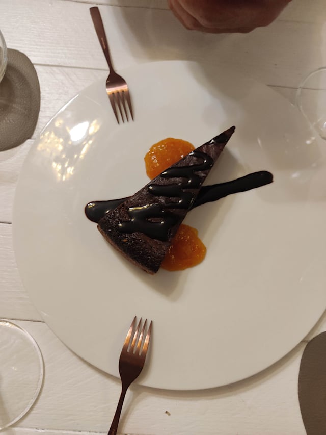 torta al mustazzolo, salsa al caffè e cioccolato, marmellata di kumquat, frutta secca e polvere di mandarino