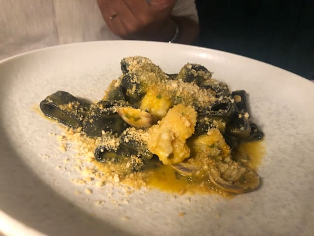 con datterino giallo profumato al basilico, tocchetti di pescatrice, vongole veraci e polvere di tarallo pugliese