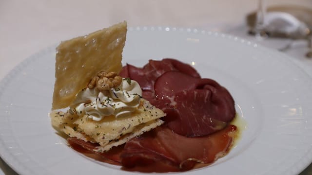 Carpaccio di fesa di manzo di nostra produzione con mousse di caprino e scaglie di mandorle