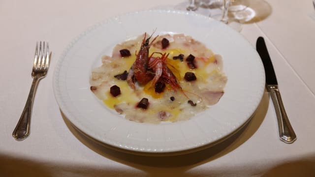 Risotto ai crostacei con crudo di gambero rosso del mediterraneo
