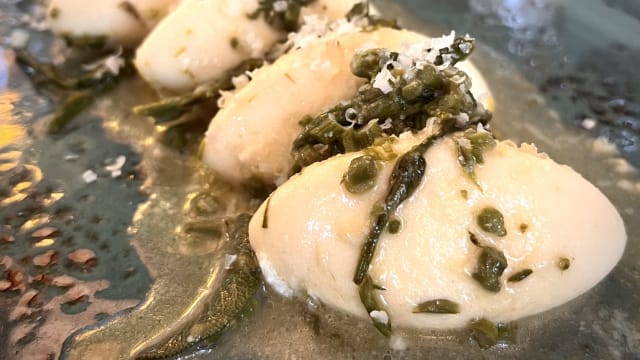 I nostri gnudi composti da ricotta La Luciana, formaggio Tre Latti a caglio vegetale e scaglie di tartufo nero o asparagi di bosco secondo la disponibilità