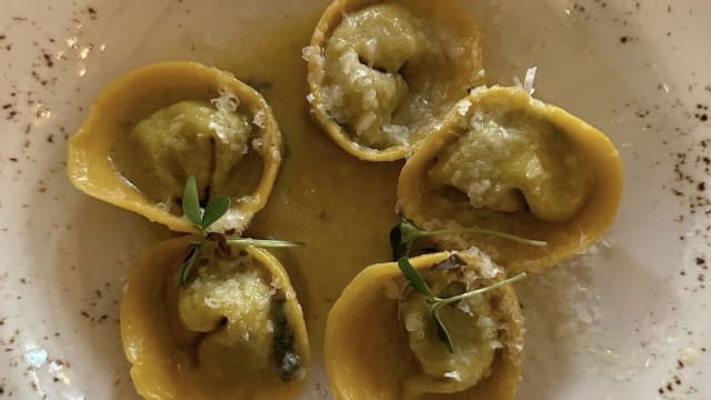 I nostri ravioli fatti a mano ripieni di ricotta di pura pecora La Pec e ortica serviti con burro Beppino Occelli, salvia e formaggio Tre Latti Lari a caglio vegetale