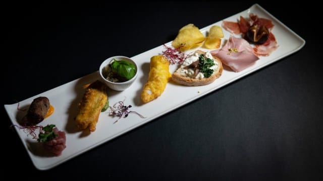 (Cotto arrosto, cipolla caramellata, pomodorini semidry e scaglie di pecorino)