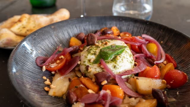- Camembert di bufala rôti au miel et à l’origan, posé sur une focaccia moelleuse.
