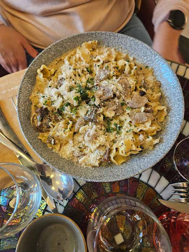 - Pâtes farcies au chèvre et à la figue, servies avec une sauce au fromage Taleggio et brisures de noix.