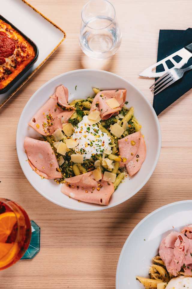 - Pesto de pistache, parmesan, mortadelle, stracciatella.