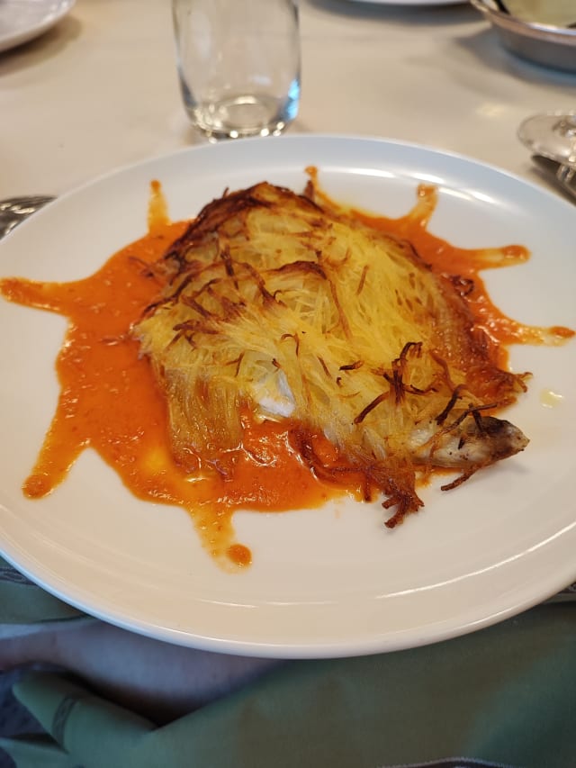 6.5/10Booking was easy. Staff pleasant. Ordered sea bass with crispy potato topping and tomato sauce. As is usual in Italy it comes alone without vegetables but fish was a little dry and the amount of sauce very inadequate. My partner ordered lamb chops which came with salad leaves. There were three huge hunks of meat which he described as nice. The hotel restaurant is lacking in atmosphere: bright lights and hard surfaces make it look and sound unpleasant.