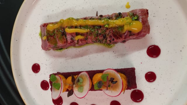 Filet mignon , jus aigre doux & panais en trois textures