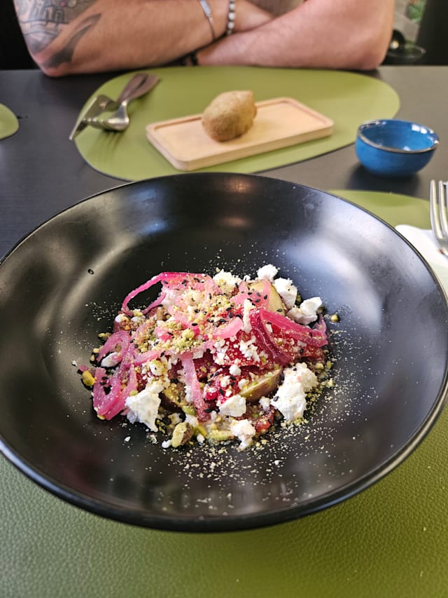 Insalata russa primaverile con speck d'anatra e citronette di lampone e tahina