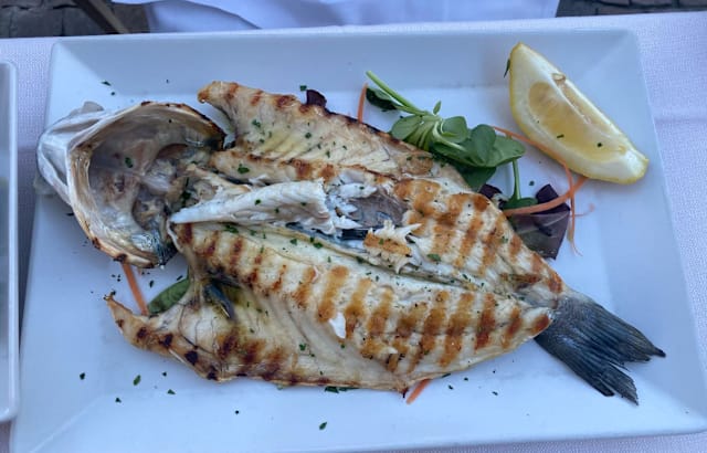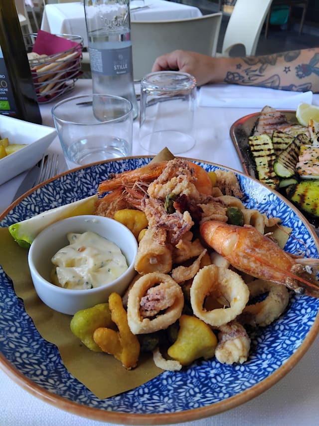 Ostrica aromatizzata alla vinaigrette di erba cipollina guazzetto di moscardini* carpaccio di salmone polpette di tonno* insalatina di polpo croccante* gamberi rosa profumati agli agrumi* baccalà alla messinese