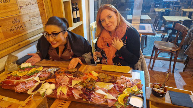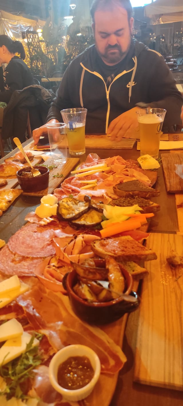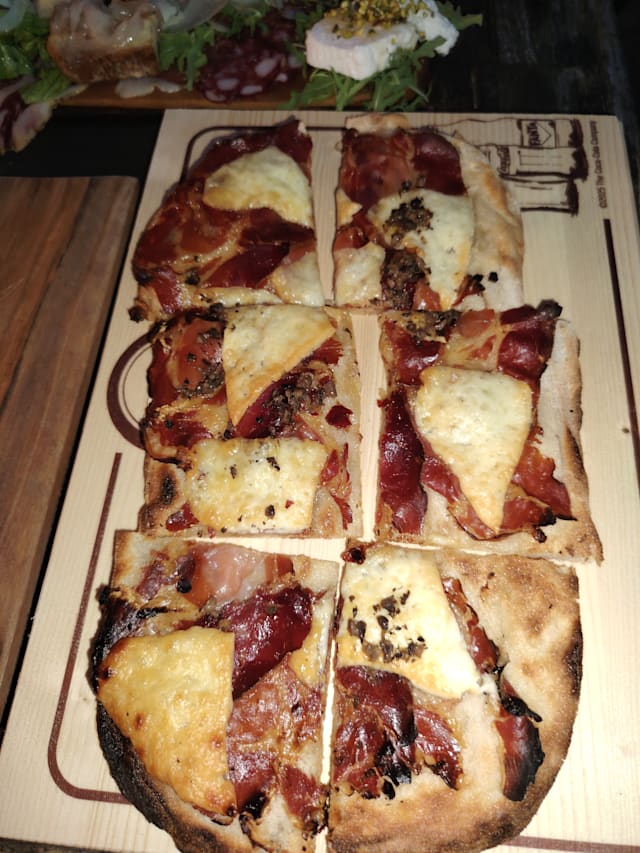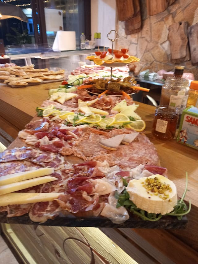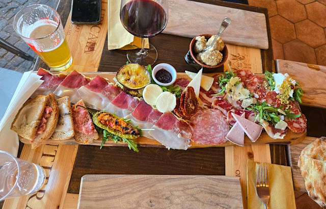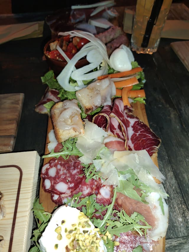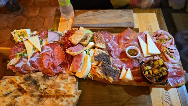 Gran mix di salumi di cinta senese e pecorini toscani raffinati e formaggi freschi ( Prosciutto crudo, finocchiona, salame, capocollo, lonzino, pecorini, ricotta di bufala con miele al tartufo, mozzarella di bufala, ) bruschette con salsiccia e lardo e verdure sotto'olio)