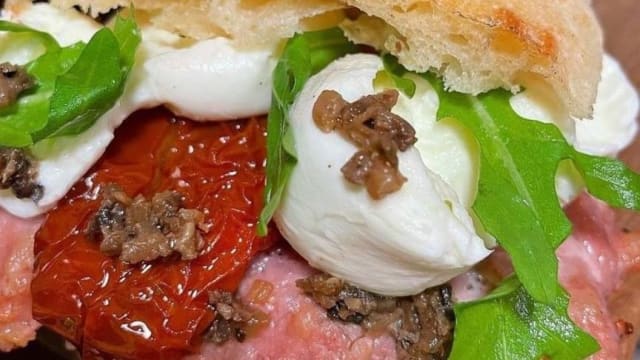 Gran mix di salumi di cinta senese e pecorini toscani raffinati e formaggi freschi ( Prosciutto crudo, finocchiona, salame, capocollo, lonzino, pecorini, ricotta di bufala con miele al tartufo, mozzarella di bufala, ) bruschette con salsiccia e lardo e verdure sotto'olio)