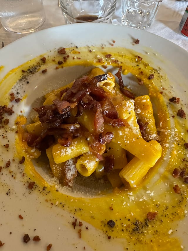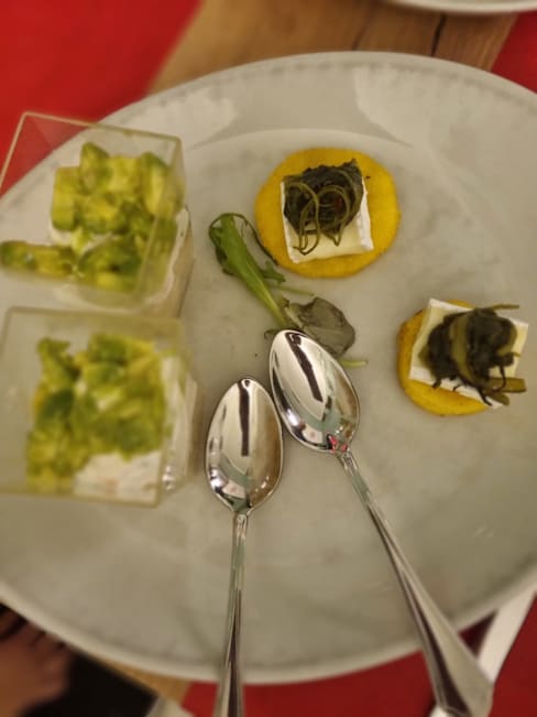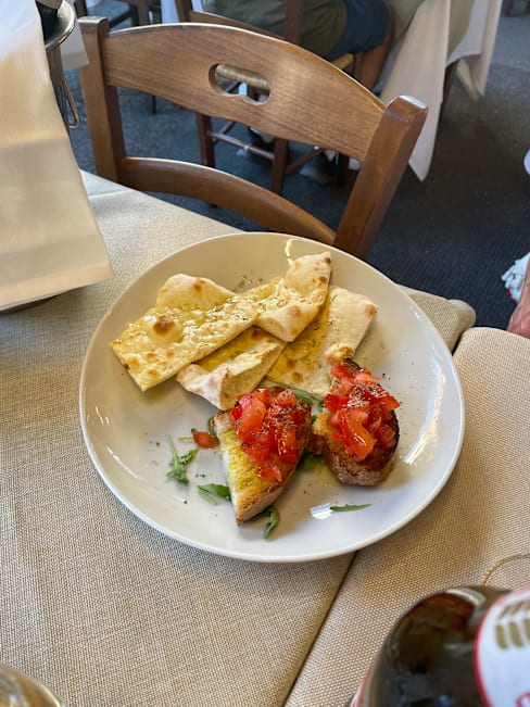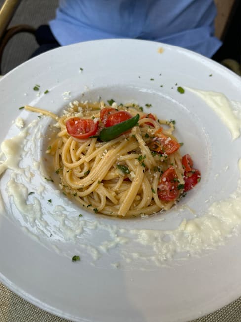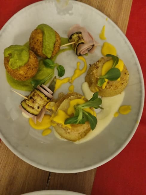 8.5/10Really beautiful food. The food sharing pater to start was perfect. Followed by pasta with garlic, cherry tomatoes and basil, simple and really lovely. The other dish was eggplant, zucchini and zucchini flowers. Plus a Parmesan sauce on the side as decoration. Very welcoming and helpful