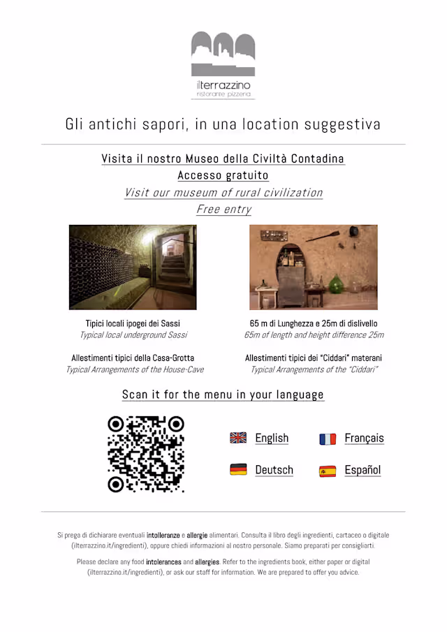 10/10The restaurant has a nice view.The service and the food were great .I reccomend to go there but make a reservation in advance to have a table outside.Inside you can visit cantina with the Sassi architecture full of history!