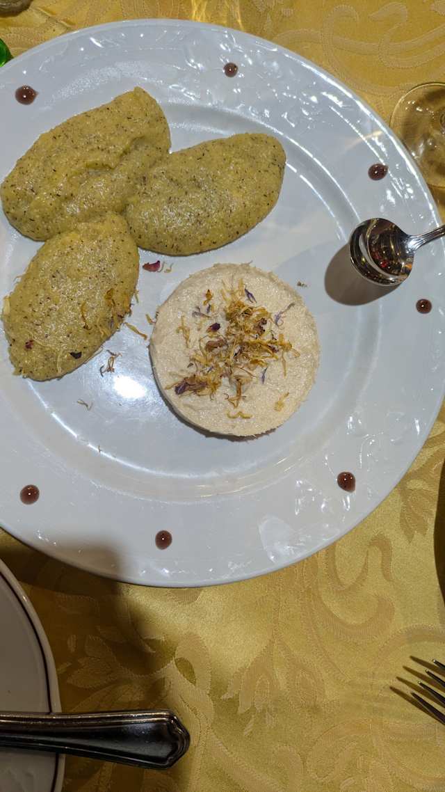 - Degustazione di terrina di fegato grasso, terrina di Quaglia, marroni della Valtellina e petto d'oca affumicato con pane alle olive