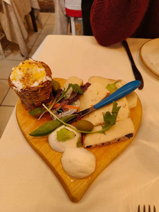 - Affettati misti al tagliere, formaggi tipici con miele d'acacia, mozzarella di bufala, ceci con funghi e tartufo, fagioli con cotiche, trippa alla romana, verdure al coccietto, fritti misti, caramella del norcino, fragole, primo sale con aсеto вalasamico, ricotta noci e miele, coratella (non sempre)