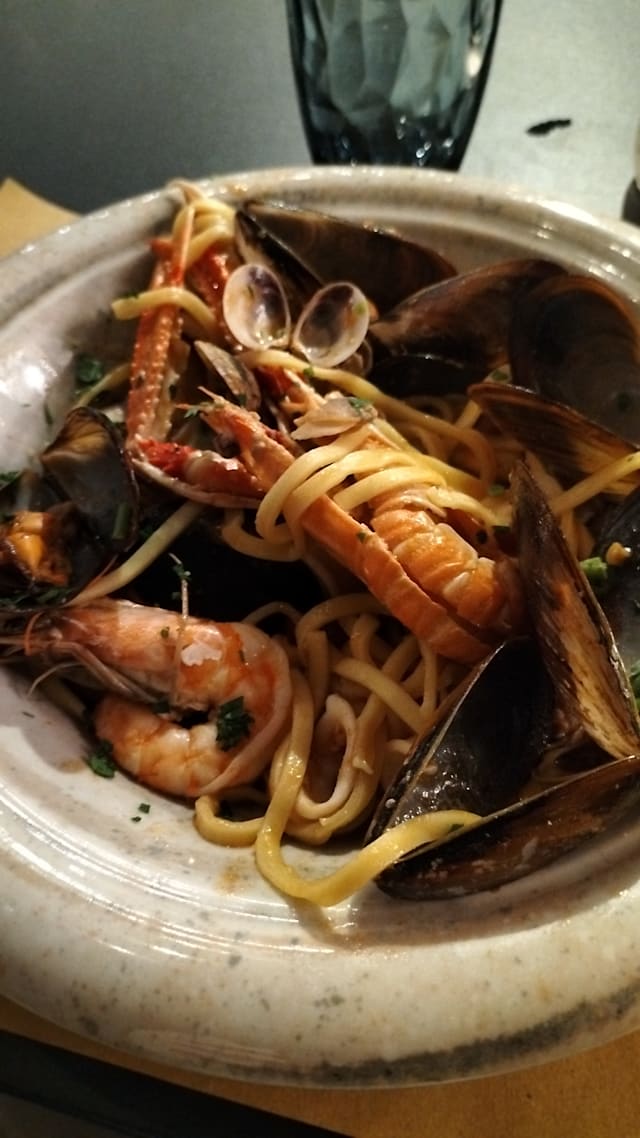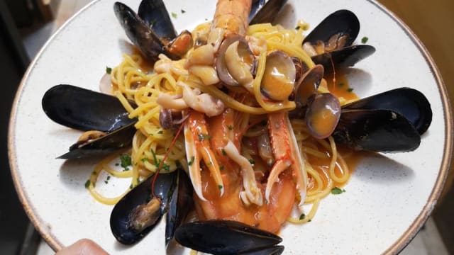 Trenette con tutti i sapori del mare, calamaretti, vongole, cozze, gamberi e scampi.