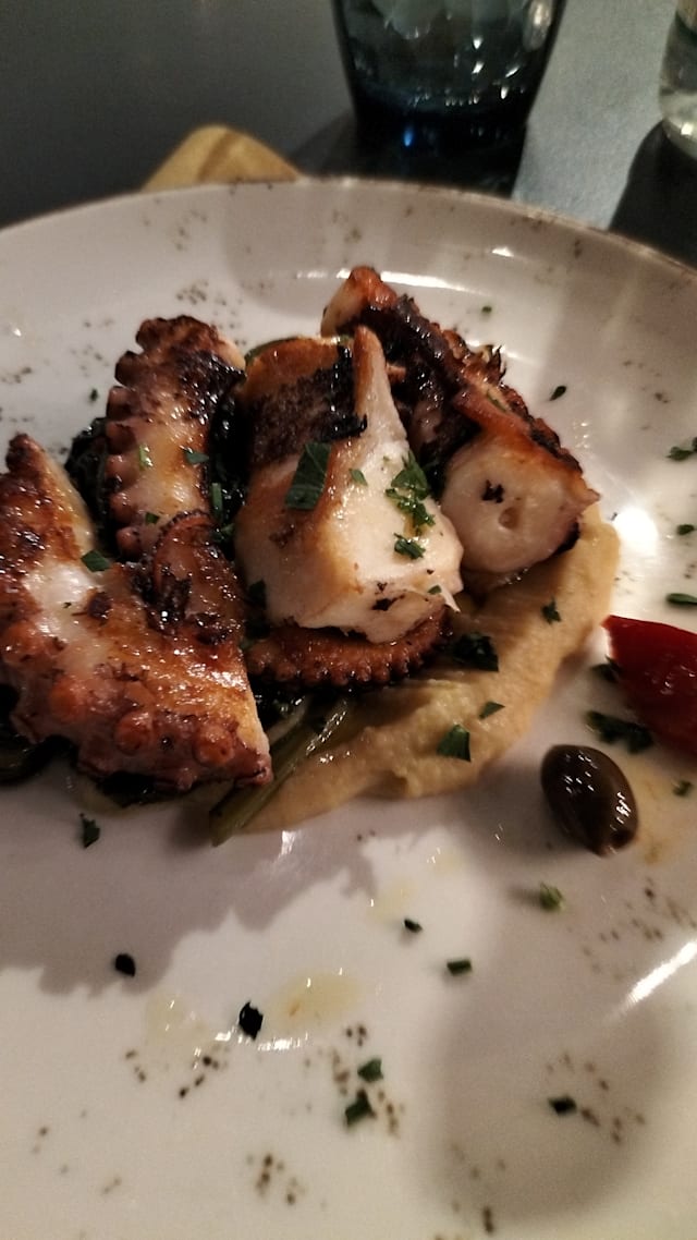 Tentacoli di polpo croccante con crema di patate e verdurine.