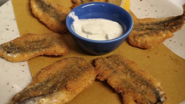 Acciughe impanate e fritte e frittelle di baccalà con salsa fresca allo yogurt.