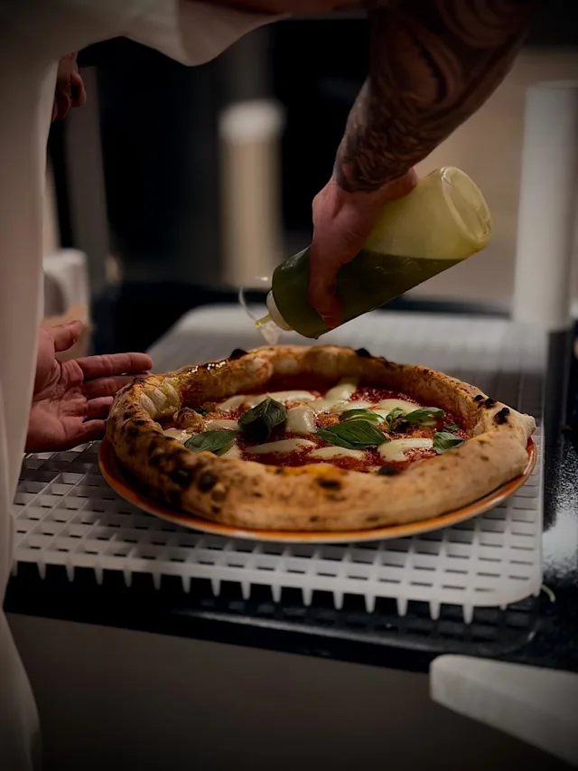 - Base fior di latte e provola affumicata a paglia di agerola, speck suino nero speziato, basilico, olio evo