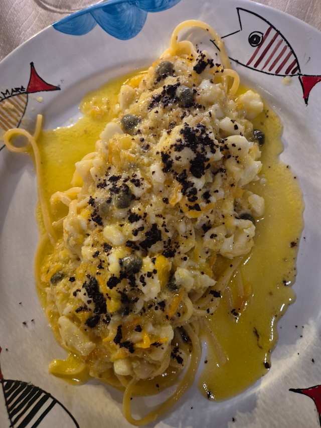10/10Everything was really nice presented and tasty some plates was even above our expectations such as the fried Cod and the “pasta capperi, pomodorini, olive e pesce spada”. There weren’t many starters that are usually a must have, here in this area of Italy such a bruschetta, fried bread with sea weed (frittelle ale alghe) or a side dish such as zucchini or aubergine (except for parmigiana that we haven’t tried but we heard it’s delicious in this restaurant). 10/10 well deserved. :)