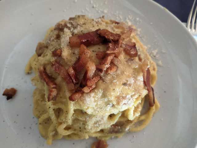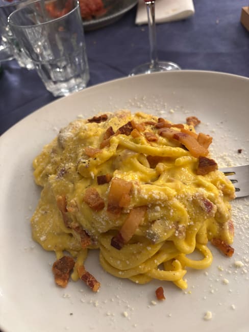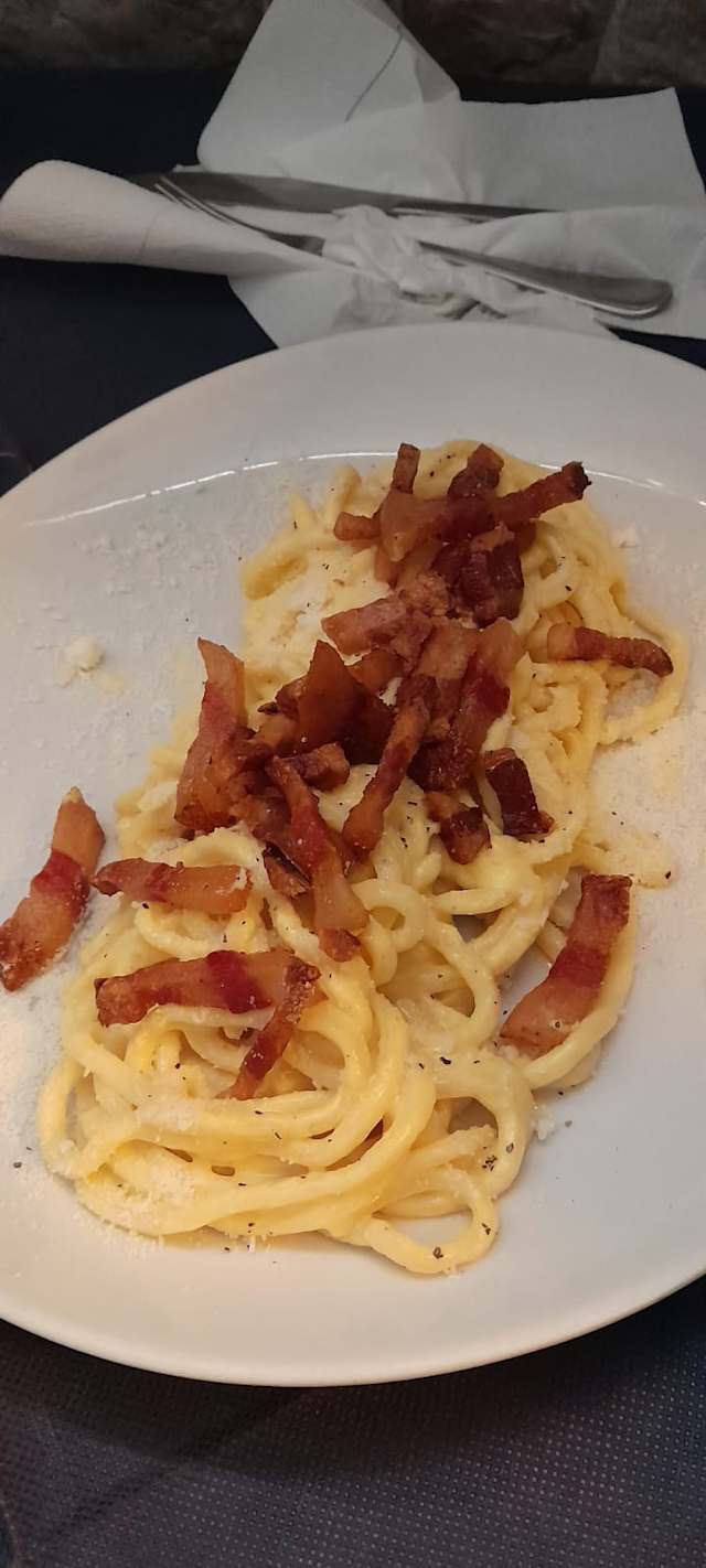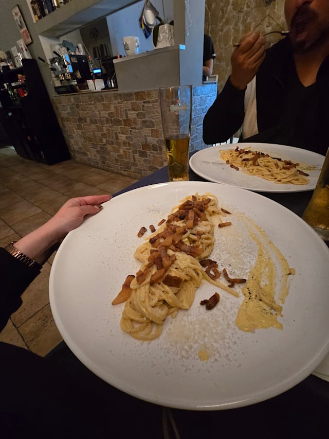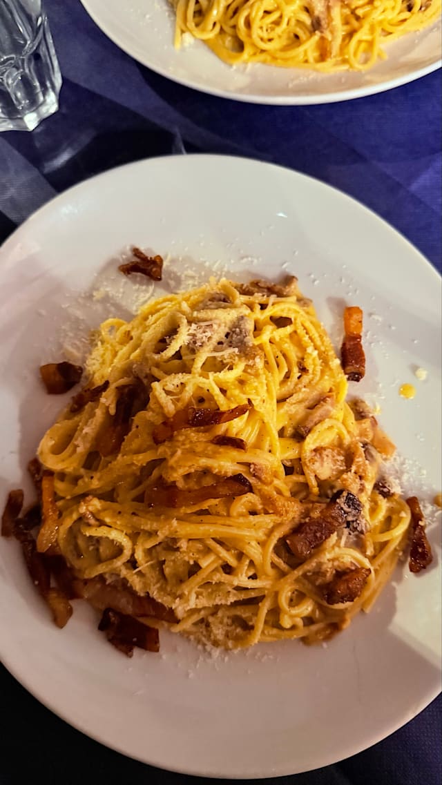 8.5/10We went for a light dinner, a carbonara and aubergine parmigiana. We always take wine but this time the price was too high (the house wine was 25€ and the one we took was 30€ Service was very kind by a lady that saldo acted as cashier
