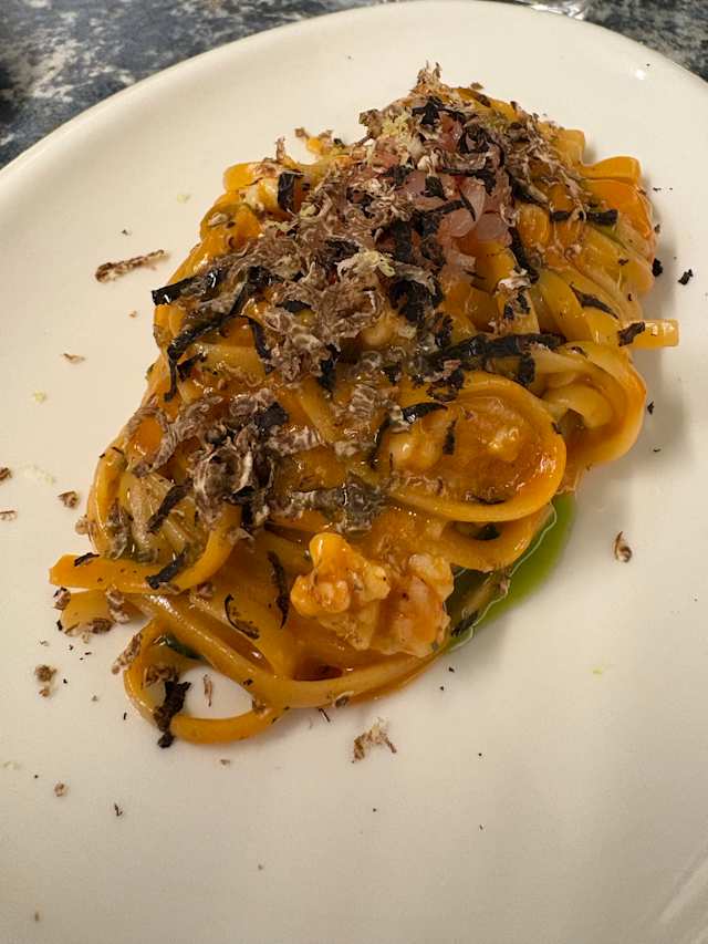 - Linguine con burro francese, bottarga di tonno, limone nero e battuto di tonno rosso