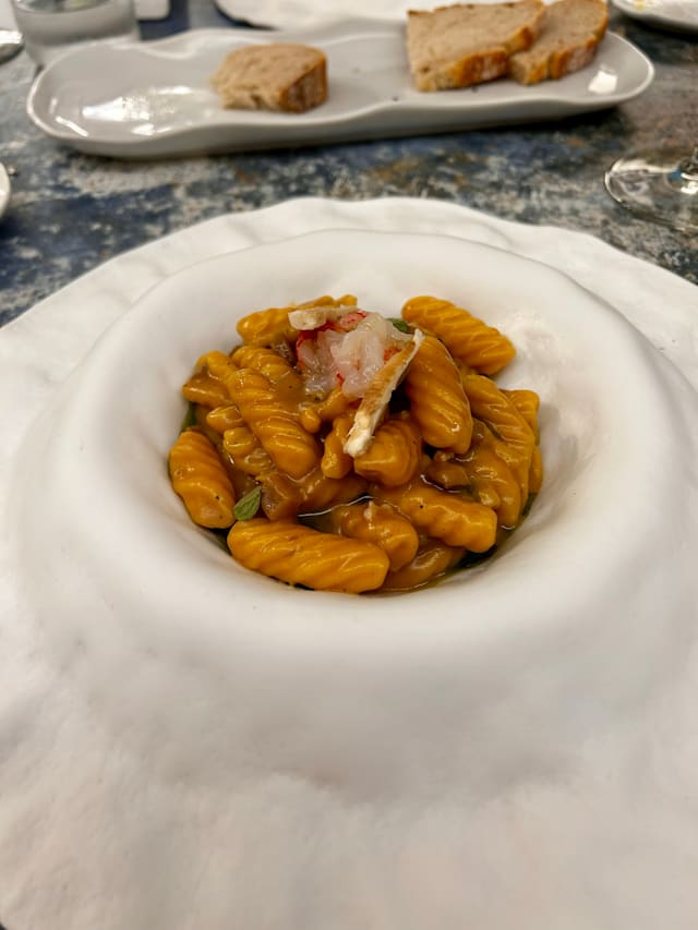 Mezzi paccheri con crema di zucca, zucca arrosto, crumble alla zucca e fonduta di pecorino