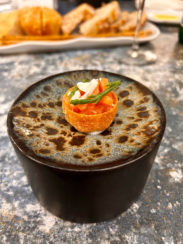 Tonno in crosta con crema di sedano rapa al té nero e granita di melograno
