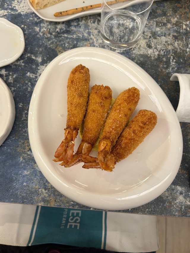 Mazzancolle in crosta di panko, funghi e crema di stracchino
