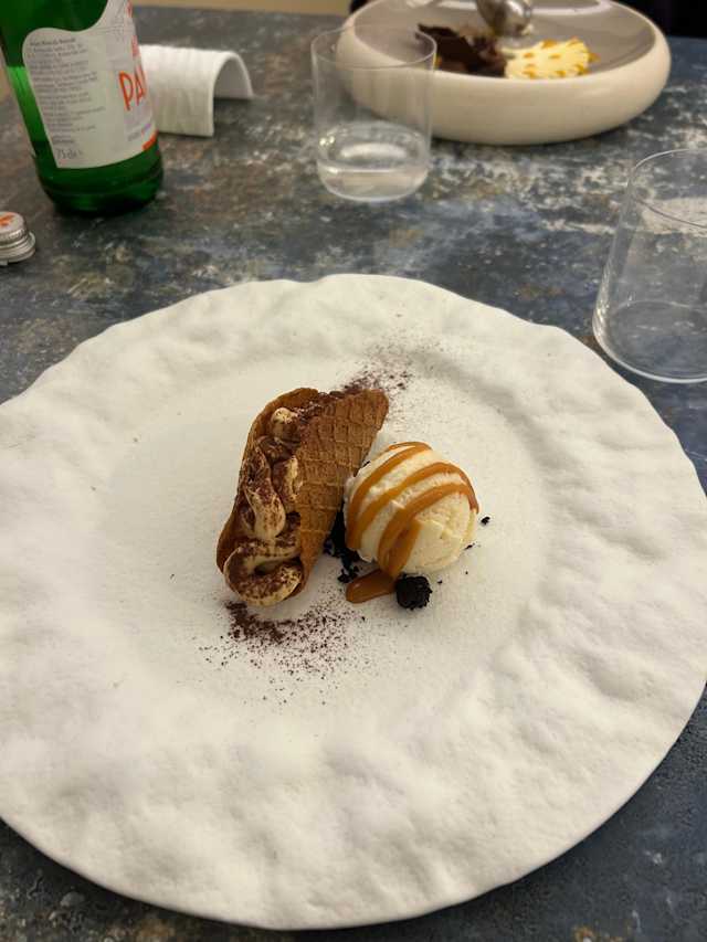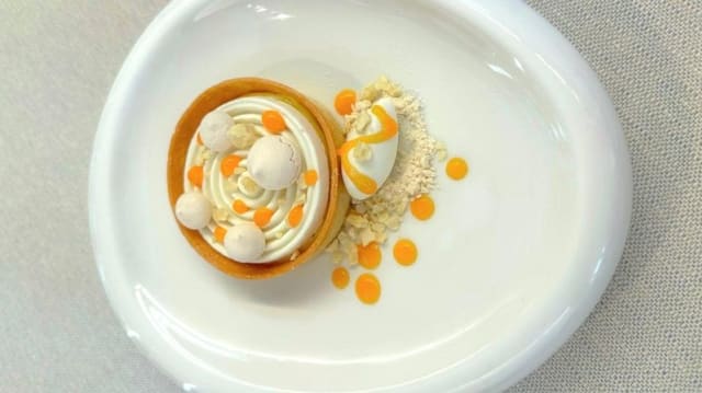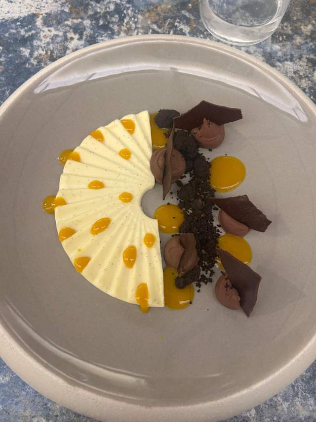 Mousse al cioccolato bianco, cremoso al cioccolato fondente, crumble al cacao amaro e sale maldon. Gel al fruit passion