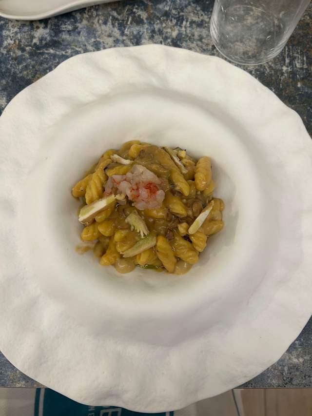 Cavatelli su crema di porcini con crudo cotto di scampi ed olio alle erbe