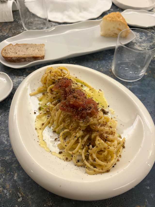 Linguine con burro francese, bottarga di tonno, limone nero e battuto di tonno rosso
