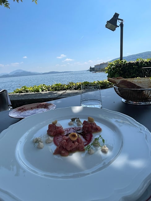 10/10Fabulous view of Isola Bella & Lake Maggiore from outside terrace at south end if tiny Isola Superiore. Magical dmall lake Boat transfers available through restaurant. Perfectly prepared delicious meal. Smiling friendly impeccable service & menus in English, Italian, etc. Foods & Wines from immediate region highlighted. Go on clear day or night if possible but definitely go.