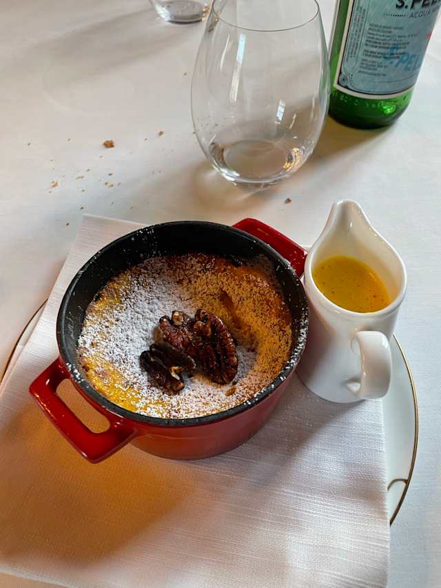- Souffle’ al cioccolato nero guajana valrhona , salsa al caffe’, arachidi salate