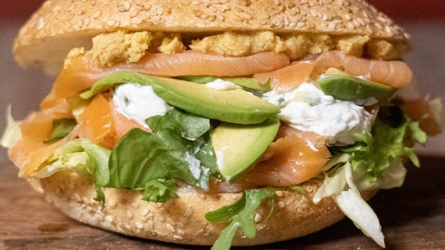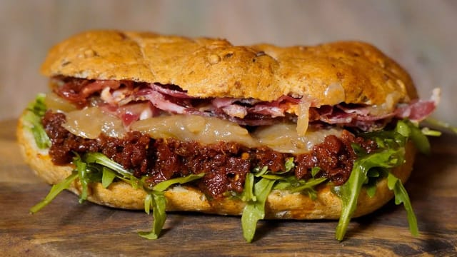 - Pane al sesamo, bresaola punta d’anca, crema di pecorino romano i.g.p., porcini valtellina, rucola, castagne caramellate, maionese al “chianti”.