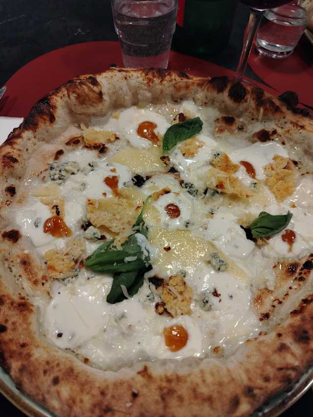 - Crema di friarielli, fiordilatte, salsiccia a punta di coltello, marmellata di peperoncino, olio evo, basilico