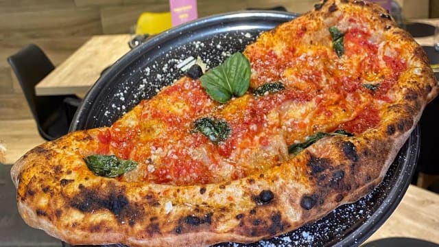 Pizza fritta con pomodoro san marzano, fior di latte di agerola, olio evo, parmigiano reggiano dop, basilico