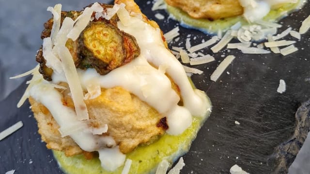 Vellutata di zucchine "home made", fonduta di parmigiano reggiano dop, chips di zucchine fritte. provola di agerola, olio evo., parmigiano reggiano dop. basilico