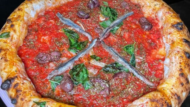 Pomodoro 100% italiano casa gustarosso, alici di cetara armatore. Aglio bianco, origano, olio EVO, olive nere, capperi in salamoia, basilico fresco.