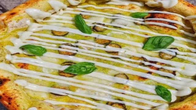 Fior di latte agerolese, funghi shitake saltati in padella, in uscita: polpettine di carne macinata, salsa teriyaki, crema di edamame, maionese al wasaby, sesamo tostato, olio EVO, grana, basilico fresco.