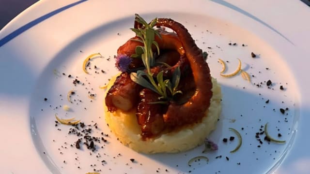 Polpo arrostito alla salsa teriyaki su spuma di patate al limone