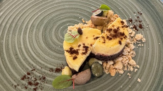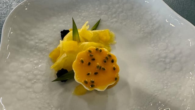 Sable al cacao, semifreddo al mango e polvere di cocco