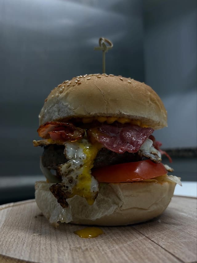 Pane al sesamo, hamburger di fassona o chianina, salsa cheddar, lattuga, pomodoro, bacon e uovo all’occhio di bue.